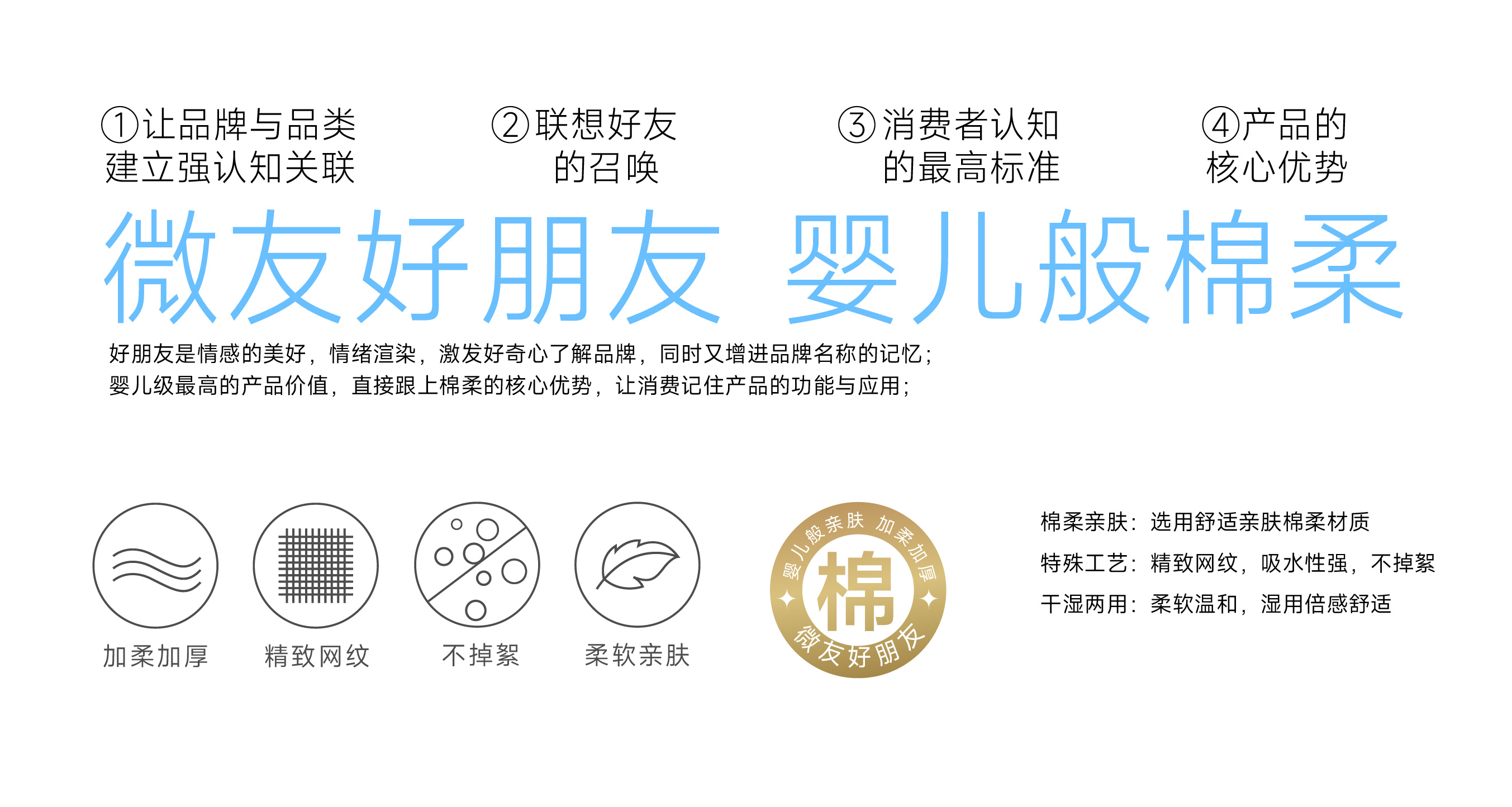 微友洗脸巾,一个坚持好品质,好产品的企业,有自己的生产工厂,能够在品质上做到最优,本次课题主要是解决产品包装设计以及话语体系的升级;